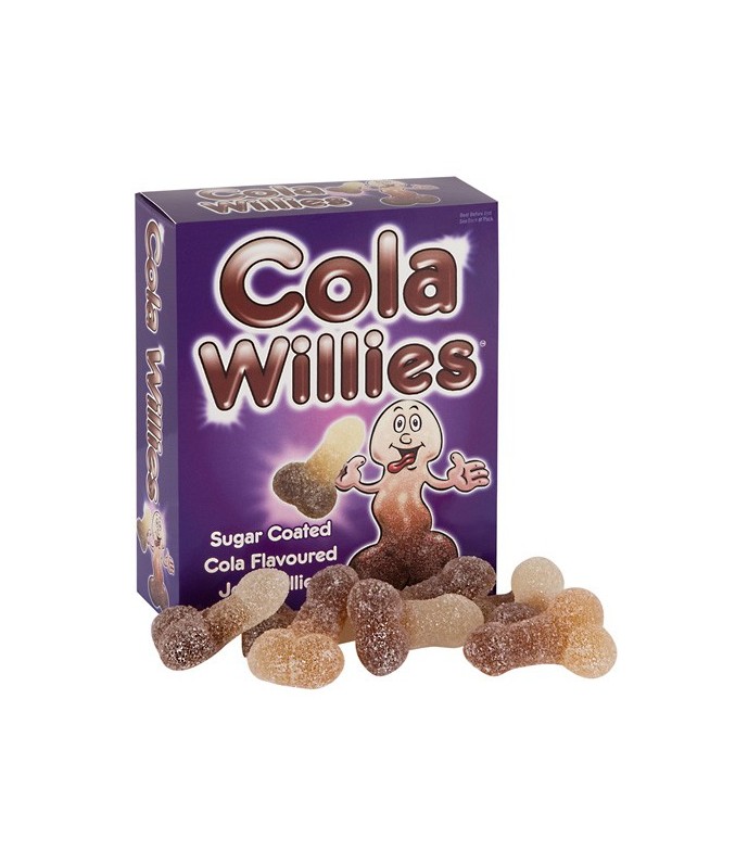 Sugar-coated wine-gum willies. Cola-flavour. White/brown. 120g.
