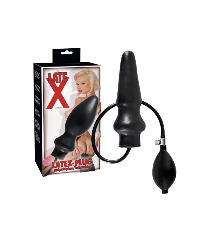 Inflatable anal plug made of black latex. Length approx. 20 cm, Ø 2.5-9.6 cm. Tube length approx. 39 cm. With hand pump and release valve. Material: latex.