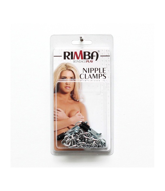 Metalen tepelklemmen met ketting. Op de klemmen zit een rubberen bescherming voor de tepels